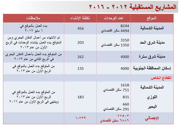 وأفاد أن وزارة الإسكان قد أوضحت خلال الاجتماع أن الاستعدادات لتنفيذ مشروع شرق الحد والذي سيشمل 3150 وحدة سكنية و 1350 سكنًا اقتصاديًا و مشروع مدينة شرق سترة والمتضمن 4000 وحدة سكنية، بالإضافة إلى إسكان المحافظة الجنوبية والمتضمن 4000 وحدة سكنية قد قطعت شوطاً كبيراً خاصة فيما يتعلق بتهيئة الأرض واستكمال عمليات الدفان والاستملاك، في حين ينتظر أن تستكمل الإجراءات القانونية لتمويل المشاريع التي ستحظى بتمويل خليجي خلال الفترة المقبلة.