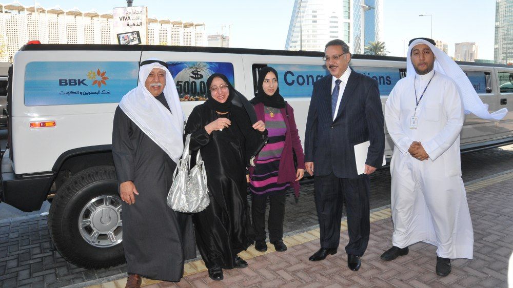 أما الفائرة المحظوظة بالجائزة الكبرى فهي شيخة علي صالح، وهي طالبة بحرينية تدرس الطب، حيث حظيت شيخة باستقبال مميز، بدءاً من اصطحابها وعدد من أفراد أسرتها إلى الفرع الرئيسي لبنك البحرين والكويت بسيارة هامر ليموزين فاخرة، واستقبالها من قبل الرئيس التنفيذي للبنك، عبدالكريم بوجيري، حيث جرى احتفال خاص بهذه المناسبة أمس الثلثاء (5 فبراير/ شباط 2013)، قام خلاله بوجيري بتسليم شيخة شيكاً بمبلغ 500 ألف دولار. حضر حفل الاستقبال المديران العامان في البنك الشيخ راشد آل خليفة ورياض ساتر، إلى جانب عدد من أعضاء الإدارة العليا في البنك.