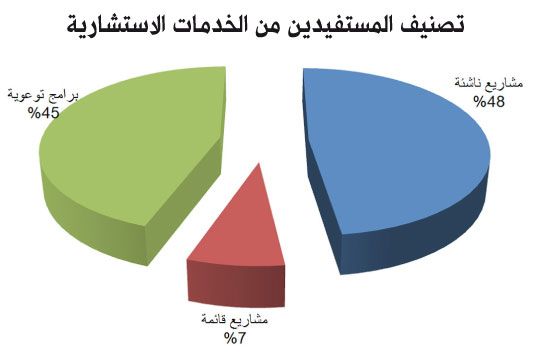 وبحسب تصنيف نوعية المؤسسات المستفيدة من الخدمات الاستشارية، بلغ عدد المؤسسات الجديدة (الناشئة) 908 مؤسسات، فيما بلغ عدد المؤسسات القائمة التي حصلت على الاستشارات بهدف التوسعة والتطوير 139 مؤسسة في مختلف القطاعات، كما بلغ عدد الأفراد المستفيدين من البرامج التدريبية والتوعوية 844 مستفيداً.