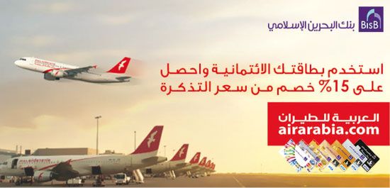 أعلن بنك البحرين الإسلامي عن تعاونه مع شركة العربية للطيران لتقديم عروض مميزة لزبائن البنك من حاملي البطاقات الائتمانية، حيث يتضمن هذا العرض حصول حاملي بطاقات البنك الائتمانية على خصم بنسبة 15 في المئة عند شراء تذاكر لوجهات محددة عبر العربية للطيران وذلك في مقرها الكائن بمجمع اليتيم.