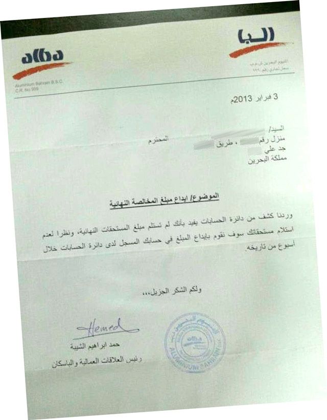 قال رئيس النقابة العمالية لشركة ألمنيوم البحرين (ألبا) محمد علي مكي إن 42 مفصولاً من الشركة على خلفية الأحداث السياسية والذين سبق أن وقعوا عقود تسوية للعودة إلى العمل في مارس/آذار الماضي تحت إشراف منظمة العمل الدولية تسلموا من الشركة رسائل مسجلة عن طريق البريد تشعرهم بإيداع مستحقاتهم النهائية في حساباتهم البنكية.