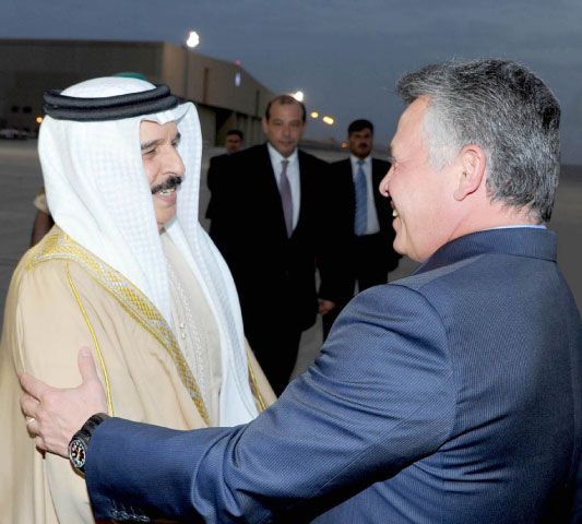 وكان جلالة الملك في مقدمة مستقبلي العاهل الأردني لدى وصوله إلى قاعدة الصخير الجوية، أمس (الأحد). كما كان في الاستقبال عدد من كبار أفراد العائلة المالكة وعدد من الوزراء ومحافظ المحافظة الجنوبية وكبار ضباط سلاح الجو الملكي البحريني.