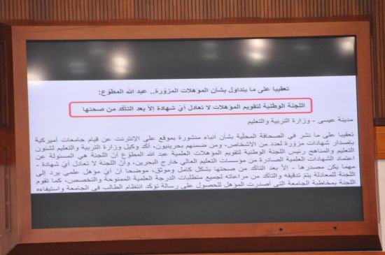 وأفاد «هؤلاء الأجانب معفيون من التأكد من صحة الشهادات والتصديق عليها من قبل مجلس التعليم العالي بينما يحرم البحرينيون من التصديق على شهاداتهم، وهذا يأتي في ظل تزوير الشهادات إذ يتم تزوير الشهادات بألفي دولار».