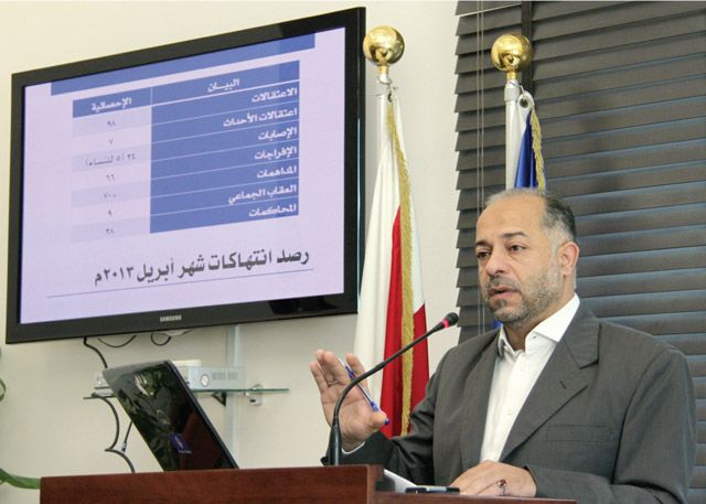 واستعرض الموسوي صوراً وأرقاماً بشأن الانتهاكات في 13 يوما من شهر ابريل الجاري قال إنها «لا تمثل الواقع بل هي ما استطعنا توثيقه، لأن الواقع إما أن يكون أكثر بكثير أو مطابقاً لها لأن هناك من لا يوثق»، مشيرا إلى أن «هناك 98 اعتقالا تم توثيقه بينها 7 اعتقالات لأحداث، وهناك 24 إصابة منها 5 إصابات لنساء ومنها إصابة الفتاة سارة إسماعيل والتي أصيبت بجزء صلب وكأن المطلق عليها قناص يريد إصابة الرأس».