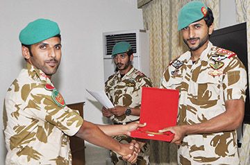 بعدها تفضل قائد الحرس الملكي العقيد الركن سمو الشيخ ناصر بن حمد آل خليفة بتوزيع الشهادات على الخريجين والجوائز التقديرية على المتفوقين في الدورتين المتخصصتين، حيث رفع سموه خالص تهانيه للخريجين، متمنيا لهم دوام التوفيق والسداد مع إخوانهم بمختلف أسلحة ووحدات قوة دفاع البحرين .