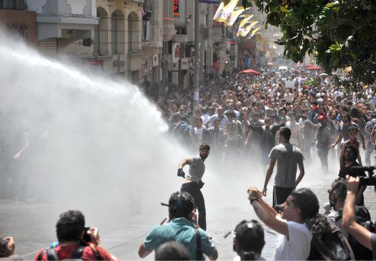 أطلقت الشرطة التركية الغاز المسيل للدموع ومدافع المياه أمس الجمعة (31 مايو/ أيار 2013) على محتجين احتلوا متنزهاً في وسط اسطنبول مما ادى إلى إصابة العشرات في أحدث أعمال التضييق الأمني العنيف على المظاهرات المعارضة للحكومة.