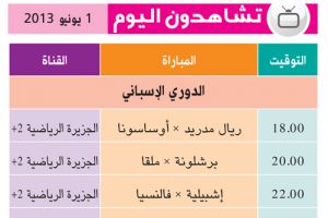 تضع "الوسط الرياضي" أمامكم أعزائنا القراء برنامج اليوم الرياضي الذي سيعرض اليوم على القنوات الرياضية ويتضمن مختلف الدوريات الأوروبية والعالمية. بالإضافة إلى جدول أين تذهب اليوم في ملاعبنا المحلية.