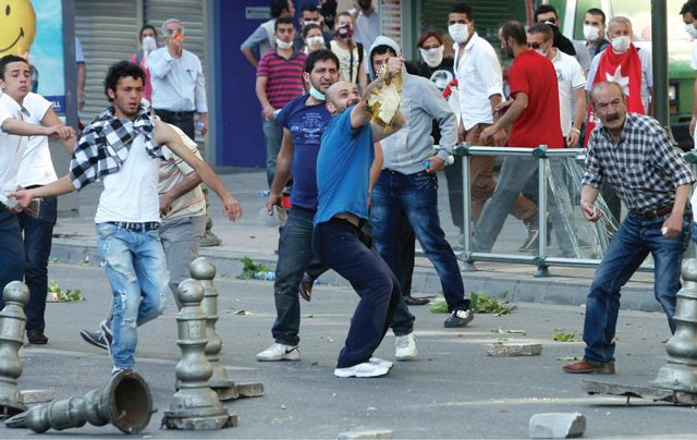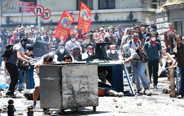 الصورة توضح أشخاص يقذفون الشرطة وكذلك سد الطرق بالحاويات للحماية، هي ذاتها نفس الأساليب التي تصفونها بالارهاب بالبحرين بينما هي تتبع صفة (الاحتجاج) في تركيا.