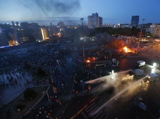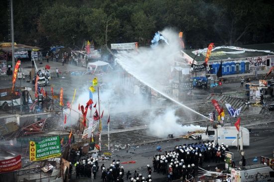 واقتحم الشرطة المدعومون بمدرعات مجهزة بخراطيم المياه الحواجز التي أقامها المتظاهرون على بعض الجادات المؤدية للساحة لكنهم لم يتحركوا في اتجاه حديقة جيزي المحاذية للساحة حيث نصب مئات المحتجين خيماً.