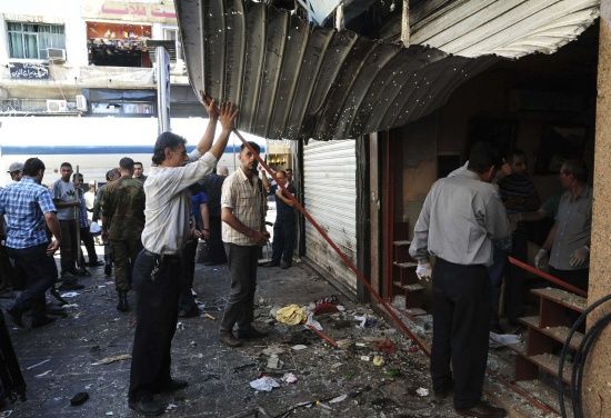 قتل 14 شخصاً على الأقل أمس الثلثاء (11 يونيو/ حزيران 2013) في انفجارين انتحاريين قرب مركز للشرطة في دمشق، بحسب الإعلام السوري، في وقت تستمر المعارك عنيفة حول مطار منغ العسكري في محافظة حلب في شمال البلاد.