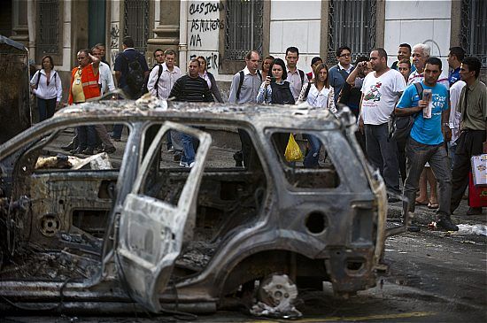 شهدت البرازيل أمس الأول (الإثنين) أكبر تظاهرات اجتماعية تهزها منذ 21 عاماً استمرت أكثر من سبع ساعات في عدد من المدن ولا سيما ريو دي جانيرو التي عاشت مشاهد حرب أهلية حقيقية.