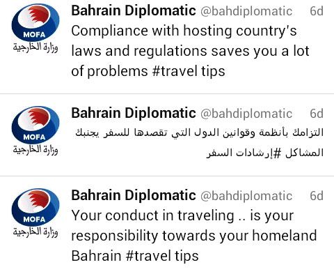 وللإطلاع على المزيد من الإرشادات بالإمكان تصفح الحساب الخاص لوزارة الخارجية وقائمة حسابات البعثات الدبلوماسية لمملكة البحرين على شبكة التواصل الاجتماعي التويتر bahdiplomatic@ . كما انه في حالات الطوارئ و طلب المساعدة بإمكان المواطنين البحرينيين المتواجدين في الخارج الاتصال مباشرة بالوزارة على هاتف رقم 17227555 او أرقام هواتف البعثات الدبلوماسية المدرجة على الموقع الالكتروني لوزارة الخارجية www.mofa.gov.bh