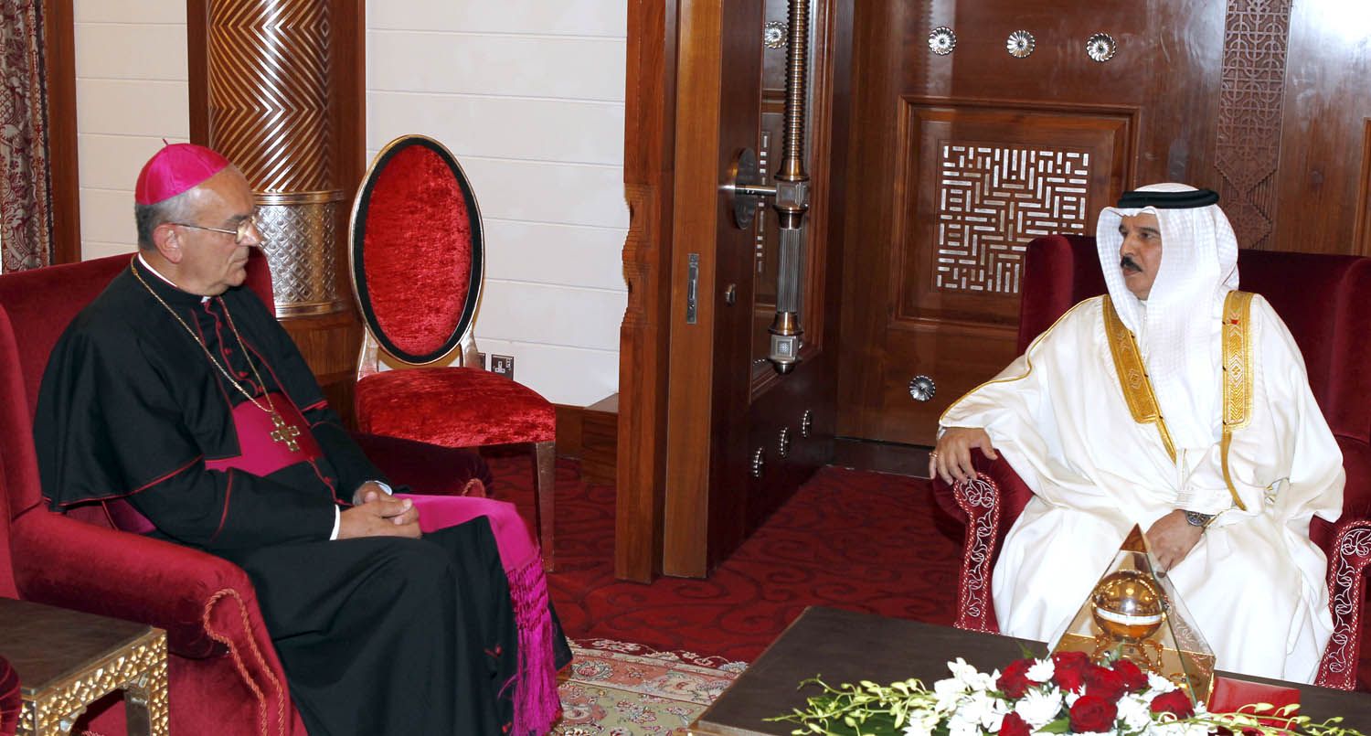 استقبل عاهل البلاد حضرة صاحب الجلالة الملك حمد بن عيسى آل خليفة في قصر الصافرية هذا اليوم الثلثاء (25 يونيو/ حزيران 2013) المطران كاميللو بالين راعي الكنيسة الكاثوليكية في أبرشية شمال شبه الجزيرة العربية وذلك بالسلام على جلالته وقد رحب جلالة الملك بالمطران كاميللو ونوه بجهوده الطيبة في المجالات الإنسانية وترسيخ قيم الخير والمحبة والتسامح .