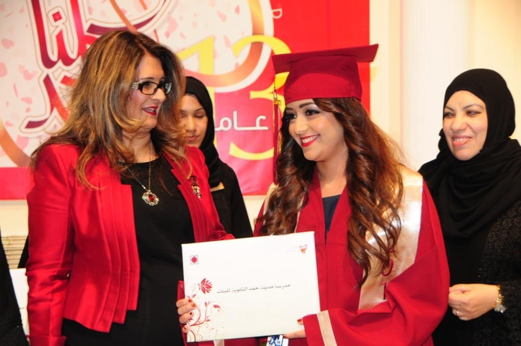 تحت رعاية وزير التربية والتعليم ماجد علي النعيمي ، وبحضور الأمين العام المساعد للتقييم والاعتمادية منى البلوشي ، نظمت مدرسة مدينة حمد الثانوية للبنات حفل تخريج الفوج السادس عشر من طالباتها للعام الدراسي 2012/2013م، وذلك بصالة وزارة التربية والتعليم بمدينة عيسى.