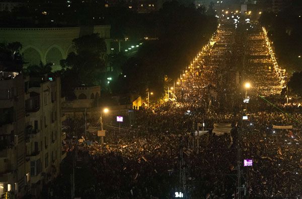 ونزلت حشود كبيرة من المصريين الى الشوارع في القاهرة والعديد من المحافظات للمطالبة باستقالة مرسي مرددة شعار "ارحل" استجابة لدعوة حملة "تمرد" التي اعلنت انها جمعت 22 مليون توقيع لسحب الثقة منه واجراء انتخابات رئاسية مبكرة.