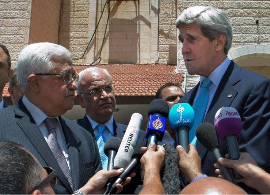 وعقد كيري عدة اجتماعات مع نتنياهو وعباس في أماكن منفصلة منذ يوم الأربعاء. وكان عباس صرح بأنه لابد أن يجمد نتنياهو البناء الاستيطاني ويعترف بحدود الضفة الغربية قبل العام 1967 كأساس لحدود الدولة الفلسطينية المستقبلية حتى يمكن استئناف المحادثات.