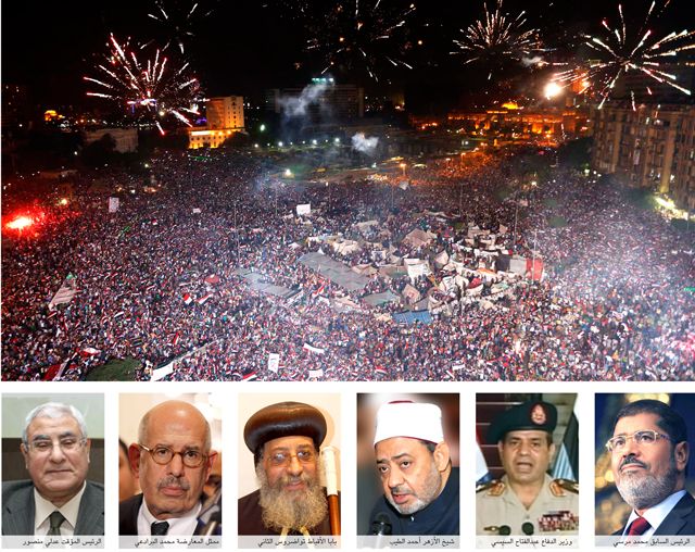 أعلن وزير الدفاع المصري، عبدالفتاح السيسي أمس الأربعاء (3 يوليو/ تموز 2013) إطاحة الرئيس الإسلامي محمد مرسي وإجراء انتخابات رئاسية مبكرة وتولي رئيس المحكمة الدستورية العليا، المستشار عدلي منصور «إدارة شئون البلاد لحين انتخاب رئيس جديد»، والذي سيؤدي اليمين الدستورية اليوم (الخميس).