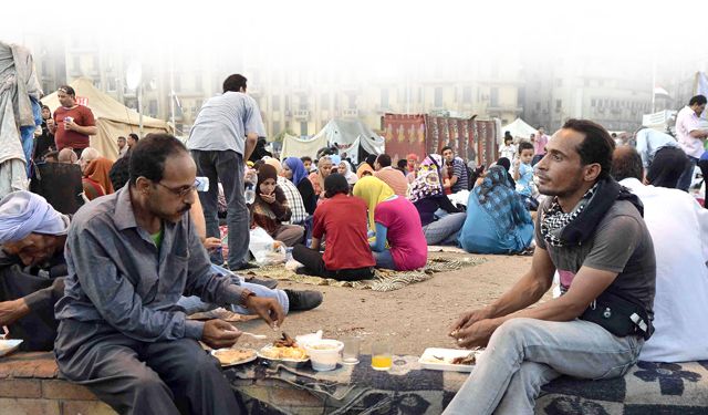 فمنذ أسبوعين يحتشد عشرات الآلاف من أنصار جماعة الإخوان، التي ينتمي إليها مرسي، في محيط مسجد رابعة العدوية في ضاحية مدينة نصر منذ أكثر من أسبوعين للمطالبة بعودة الرئيس المعزول. لكن هؤلاء ومعظمهم من قرى فقيرة لا يتلقون المعلومات إلا من منصة عملاقة يعتليها قادة الإخوان وأنصارهم.
