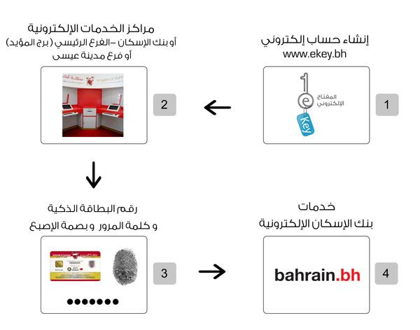 وللإستفادة من جميع هذه الخدمات الإلكترونية المتوفرة على www.bahrain.bh، يدعو بنك الإسكان عملائه الكرام إلى التسجيل في نظام المفتاح الإلكتروني (eKey) عبر زيارة أحد مكاتب بنك الإسكان أو مراكز الخدمات الإلكترونية لإتمام جميع عمليات التصديق ليتمكنوا بعد ذلك من الدخول الموحد على جميع الخدمات التسع بكل أمن وسهولة.