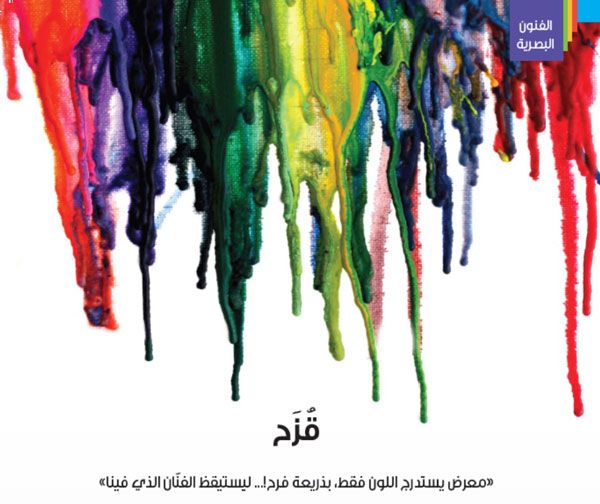 تبدأ اليوم الأحد (8 سبتمبر/ أيلول 2013) فعالية "قزح"، في تمام الساعة الثامنة مساءً في مجمع السيف التجاري، بتنظيم من مبادرة "تشكيل" المعنية بالتعاطي مع فنون الرسم والتقنيات الإبداعية الجديدة التي تأخذ بطريقها ناحية الجمهور أكثر من الفنان نفسه بذريعة الفرح، وحتى يستيقظ الفنان الذي فينا، في مهرجان تاء الشباب الخامس "تفاعل.. تناغم.. تكامل".