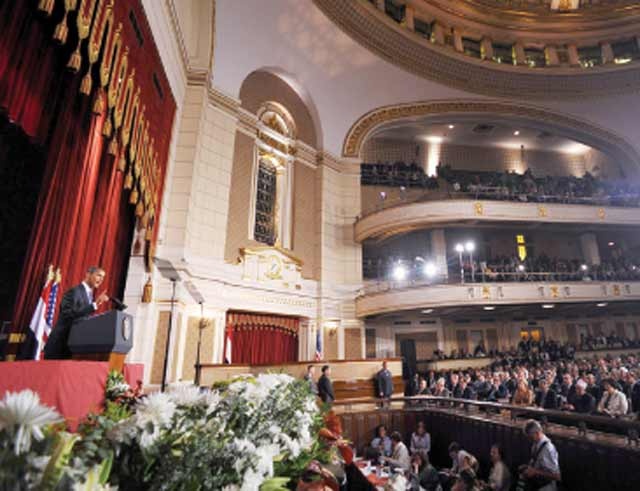 لقد أتيت إلى هنا للبحث عن بداية جديدة بين الولايات المتحدة والعالم الإسلامي استنادا إلى المصلحة المشتركة والاحترام المتبادل وهي بداية مبنية على أساس حقيقة أن أميركا والإسلام لا تعارضان بعضها البعض ولا داعٍ أبدا للتنافس فيما بينهما بل ولهما قواسم ومبادئ مشتركة يلتقيان عبرها ألا وهي مبادئ العدالة والتقدم والتسامح وكرامة كل إنسان. إنني أقوم بذلك إدراكا مني بأن التغيير لا يحدث بين ليلة وضحاها.