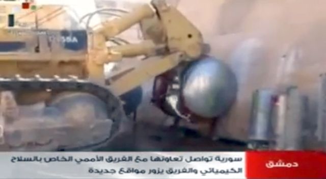 وبث التلفزيون الرسمي السوري في نشرته الإخبارية ليل الجمعة لقطات مصورة تظهر قيام مفتشي البعثة المشتركة لمنظمة حظر الأسلحة الكيماوية والأمم المتحدة بتفكيك وإتلاف تجهيزات في مواقع لإنتاج هذه الأسلحة وتخزينها.