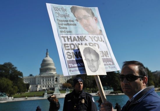وأشاد عدد كبير من المتظاهرين بسنودن اللاجئ في روسيا حالياً، ورفع كثيرون منهم لافتات كتب عليها «شكراً سنودن».