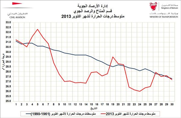 شهدت مملكة البحرين طقسا بارداً نسبياً مع انخفاض في الرطوبة النسبية وزيادة في سرعة الرياح مقارنة بالمعدل العام لشهر أكتوبر / تشرين الأول.