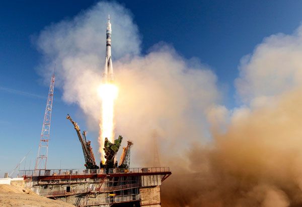 اقلعت مركبة سويوز روسية صباح اليوم الخميس (7 نوفمبر / تشرين الثاني 2013) من سهوب كازاخستان حاملة ثلاثة رواد فضاء والشعلة الاولمبية التي سيكون لها محطة في الفضاء للمرة الاولى في التاريخ على ما اظهرت المشاهد التي نقلها التلفزيون الروسي.