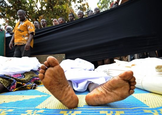 ففي مسجد حي «بي كا 5» في وسط العاصمة، كانت 54 جثة مصفوفة في قاعة الصلاة والباحة الداخلية، وتحمل آثار جروح بالسلاح الأبيض والرصاص. وفي الشوارع المجاورة، أحصى الصحافيون 25 جثة مرمية على الأرصفة.