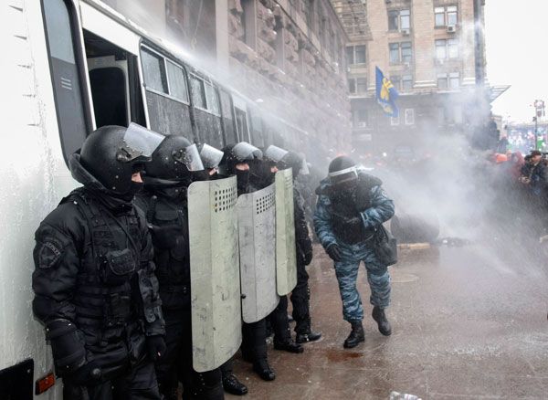 وقالت وزيرة الخارجية الاوروبية كاثرين اشتون الموجودة في كييف "ادين استخدام القوة والعنف اللذين لا يمكن ان يكونا الرد على التظاهرات السلمية، وادعو الى مزيد من ضبط النفس".
