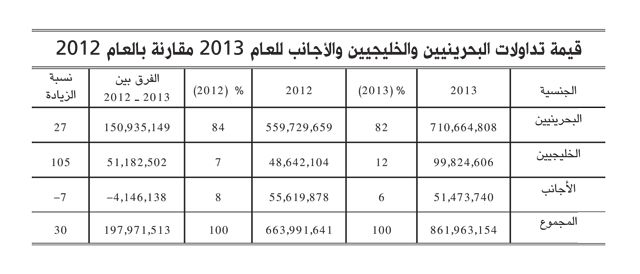 أعلن قسم العلاقات العامة والإعلام، بجهاز المساحة والتسجيل العقاري، تحقيق زيادة في التداول العقاري في العام 2013، مقارنة بالعام 2012؛ إذ بلغ مجموع حجم التداول حتى نهاية هذا العام 861.963.154 (ثمانمئة وواحد وستون مليوناً وتسعمئة وثلاثة وستون ألفاً ومئة وأربعة وخمسون ديناراً)؛ إي بحجم زيادة شارفت على المئتي مليون دينار، مقارنة بالعام 2012، وقدِّرت هذه الزيادة بنسبة 30 في المئة.