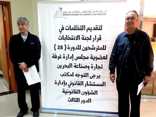 تقدم يوم أمس الإثنين (17 فبراير/ شباط 2014) مرشحاً انتخابات غرفة تجارة وصناعة البحرين نادر علاوي وعبدالكريم الفليج بطعن في الانتخابات لدى لجنة الطعون التي يرأسها مال الله الحمادي، كما يعتزمان رفع دعوى قضائية جديدة اليوم ضد تغيير موقع انتخابات غرفة تجارة وصناعة البحرين من مركز البحرين الدولي للمعارض والمؤتمرات إلى مركز عيسى الثقافي بالفاتح، إذ يريان أنه مخالف للقانون.