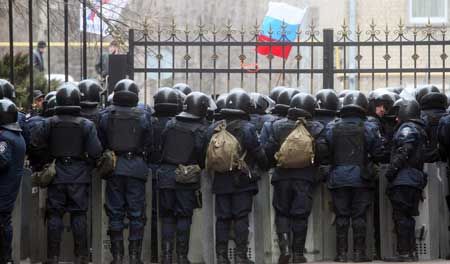ويرفع المبنى العلم الروسي بدلا من الأوكراني منذ ثلاثة أيام بينما كان محتجون يرفعون أعلام روسيا يحشدون لمظاهرات في الخارج.