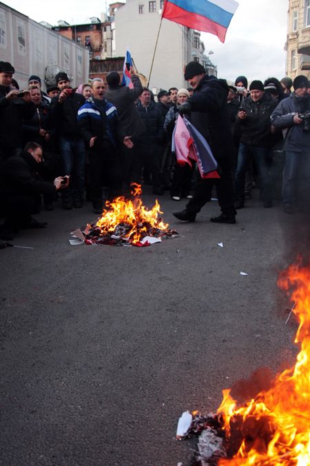 واحتشدوا لفترة امام مكتب المدعي المحلي قبل أن يتمكنوا من اختراق صفوف قوات شرطة مكافحة الشغب. وصعدت مجموعة صغيرة على السطح وانتزعت علم أوكرانيا ولوحت بعلم روسيا.