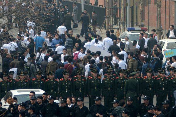 اشتبك عشرات من أقارب ركاب طائرة الركاب الماليزية المفقودة مع الشرطة أمام السفارة الماليزية في بكين اليوم الثلثاء (25 مارس / آذار 2014) مع مطالبتهم شركة الطيران والحكومة في كوالالمبور بتوضيح ماحدث.