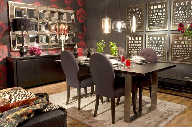 ولضبط مشهد مُعبر عن دراما الديكور، اختر لوحة ألوان لافتة للأنظار من أسود وأحمر داكن مع رمادي داكن ولمحات من الأخضر. وفكر بمفروشات رشيقة من خشب داكن ومجموعة كبيرة من الإكسسوارات المميزة: مثل ورق جدران بطبعات ضخمة، مرايا مكتنزة، منسوجات جامحة، كتابات على شكل لوحات جدارية.