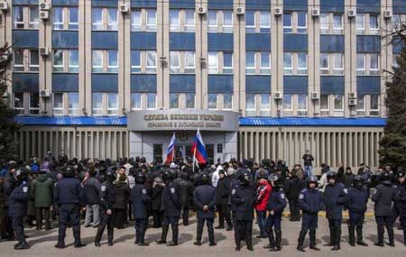 اقتحم متظاهرون موالون لروسيا الاحد (6 أبريل / نيسان 2014) مباني رسمية في شرق اوكرانيا الناطق بالروسية واحتلوا بشكل خاص مكاتب الادارة المحلية في مدينة دونيتسك، حسب ما نقل مراسلو فرانس برس.