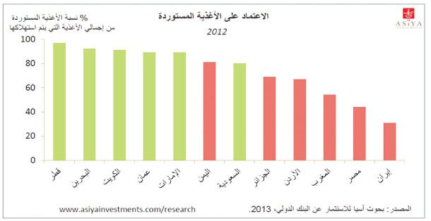وشدد التقرير الذي أعده كبير الاقتصاديين في الشركة فرانسيسكو كيتانا، على أن هذه التطورات تهم دول مجلس التعاون الخليجي لأن المنطقة من بين الأكثر ضعفا في العالم وتعتمد على استيراد الأغذية. فبسبب الظروف المناخية القاسية، استوردت المنطقة تاريخيا ما يقارب إجمالي المواد الغذائية التي يحتاجها سكانها. ووفقا لتقرير أصدره البنك الدولي حول أسعار المواد الغذائية في العالم العربي، تستورد دول مجلس التعاون الخليجي في المتوسط 90 في المائة مما تستهلكه من المواد الغذائية.
