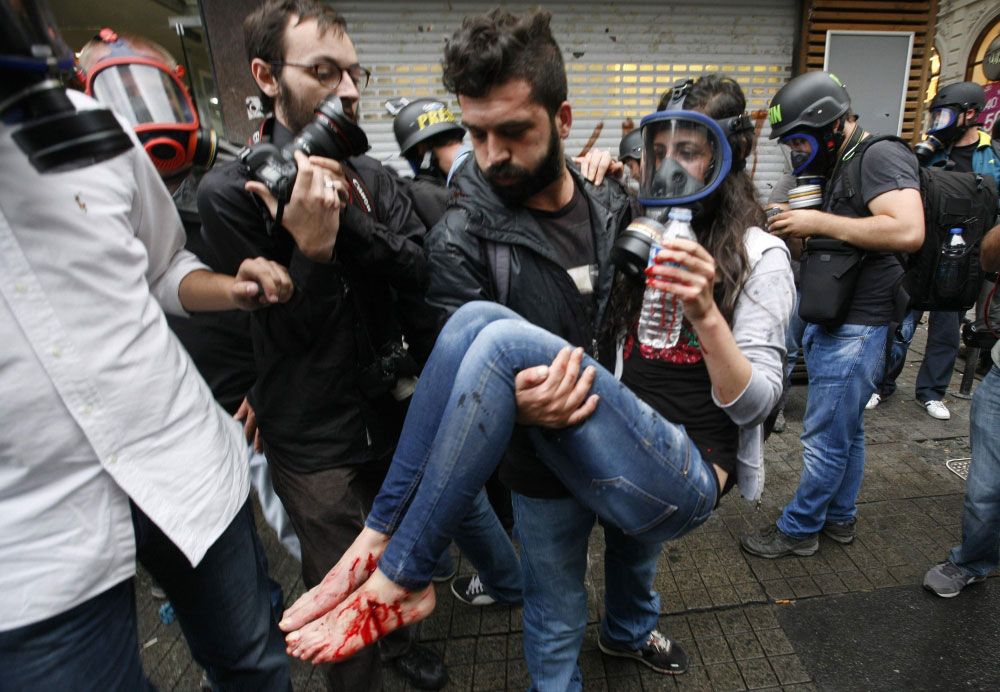 والتقط المصورون صورا عن مشاهد عنف في ساحة تقسيم في اسطنبول حيث انهالت الشرطة بالهراوات على متظاهرين كان بعضهم ممددا على الارض وينزف دما بعد استنشاق الغازات المسيلة للدموع.