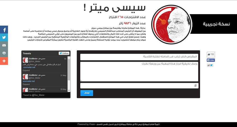 ودشن موقعا "مرسي ميتر" و"سيسي ميتر" على غرار الموقع الأمريكي "أوباميتر" الذي يتابع أداء الرئيس الأمريكي باراك أوباما.