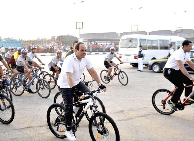 دعا الرئيس عبدالفتاح السيسي خلال ماراثون دراجات قاده مرتدياً الملابس الرياضية المصريين أمس (الجمعة) لاستخدام الدراجات والمزيد من المشي بغرض الحد من استهلاك الطاقة التي تدعمها الدولة بمليارات الدولارات سنوياً.