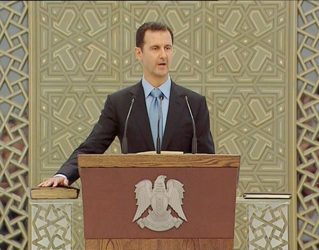 أدى الرئيس السوري بشار الأسد أمس الأربعاء (16 يوليو/ تموز 2014) اليمين الدستورية لولاية رئاسية جديدة من سبع سنوات، أمام جلسة لمجلس الشعب عقدت في قصر الشعب الرئاسي، بحسب ما أظهرت لقطات بثها التلفزيون الرسمي السوري مباشرة.