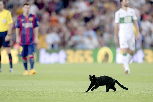 تسبب قط أسود في توقف المباراة بين برشلونة والتشي أمس الأحد (24 أغسطس/ آب 2014) في المرحلة الأولى من الدوري الإسباني لكرة القدم إثر اقتحامه الملعب بعد بداية المباراة، وحتى إخراجه بصعوبة من استاد «كامب نو».