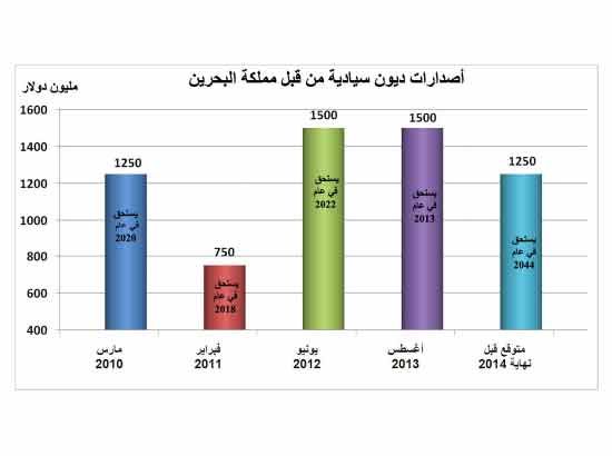 ويعد الإصدار الجديد والمعتزم إصداره هو الأطول في تاريخ البحرين، إذ إن أعلى استحقاق للسندات أصدرتها البحرين كانت لمدة عشر سنوات، وآخر إصدار كبير من سندات التنمية الحكومية أصدرته البحرين في أغسطس/ آب 2013 ويبلغ 1.5 مليار دولار ويستحق في العام 2023 بنسبة فائدة تبلغ 6.14 في المئة، في حين كان الإصدار السابق في يونيو/ حزيران 2012 وهو عبارة عن سندات تنمية بقيمة 1.5 مليار دولار ويستحق في شهر يوليو/ تموز 2020 بفائدة تبلغ 6.1، وقبلها في مارس/ آذار 2010 أصدرت البحرين سندات تنمية بقيمة 1.25 مليار دولار ويستحق في 2020 بفائدة تبلغ 5.5 في المئة، وتوقعت الوكالة أن يحظى الإصدار بإقبال جيد.