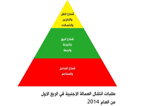 كشفت آخر إحصاءات هيئة تنظيم سوق العمل الصادرة خلال النصف الأول من عام 2014، بأن عدد طلبات انتقال العمالة الأجنبية إلى صاحب عمل جديد قد بلغت 19418 معاملة للنصف الأول من العام الجاري واستمر قطاع الفنادق والمطاعم في تحقيق أعلى نسبة من مجموع طلبات الانتقال. حيث بلغت عدد الطلبات للربع الأول من العام الجاري 8794 معاملة فيما بلغت عدد الطلبات للربع الثاني 10624 معاملة.