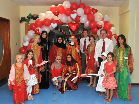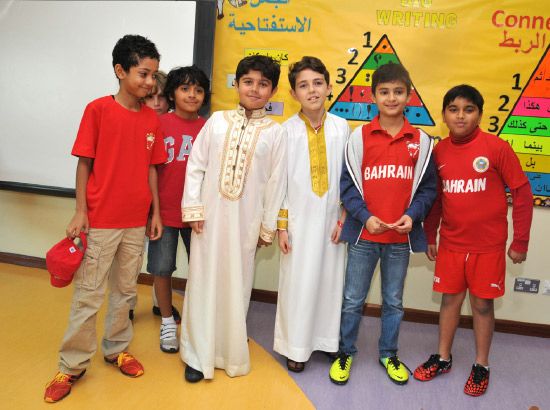 وارتدى الطلبة أزياء محلية وأخرى تحمل اللونين الأحمر والأبيض في رمزية للعلم البحريني، إضافة إلى تقديم وتناول مختلف المأكولات الشعبية والحلوى التقليدية. وقد تم تخصيص ركن للحناء، فيما كان هناك تنافس على حمل الصقور العربية من قبل طلبة المدرسة.