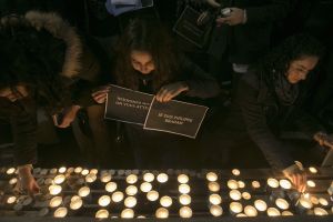 واضاء المشاركون الشموع امام مقر المركز ورفعوا لافتات كتب عليها باللغتين العربية والانكليزية "لا للارهاب".