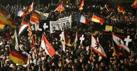 جاب نحو 25 ألف محتج مناهض للإسلاميين شوارع مدينة دريسدن بشرق ألمانيا يوم الاثنين وحمل كثيرون لافتات تحمل شعارات معادية للمهاجرين ووقفوا دقيقة حدادا على أرواح ضحايا هجمات الأسبوع الماضي في فرنسا.