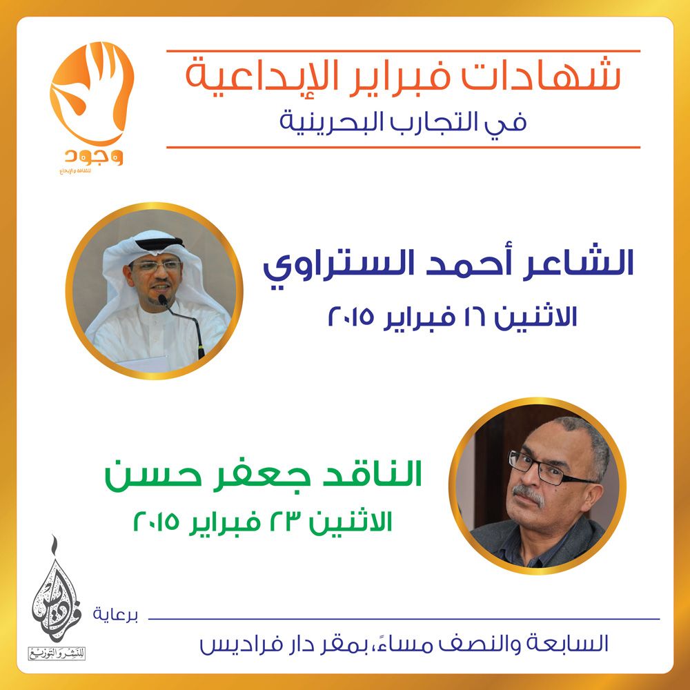 ومن المقرر في شهر فبراير/شباط 2015 أن يكون كل من الشاعر أحمد الستراوي، والناقد جعفر حسن مع موعد للإدلاء بشهادتهم الإبداعية. فيما تتابع الشهادات في شهر مارس/آذار 2015 حيث نلتقي بكل من القاص والروائي أحمد المؤذن، والروائية منيرة سوار، والشاعرة ليلى السيد و الشاعر قاسم حداد، ضمن هذه التواريخ: الشاعر "أحمد الستراوي" مساء الإثنين 16 فبراير 2015 ، الناقد "جعفر حسن" مساء الإثنين 23 فبراير 2015، القاص والروائي "أحمد المؤذن" مساء الإثنين 2 مارس 2015، الروائية "منيرة سوار" مساء الإثنين 9 مارس 2015 ، الشاعرة " ليلى السيد" مساء الإثنين 16 مارس 2015، الشاعر " قاسم حداد" مساء الثلاثاء 31 مارس 2015. الفعاليات تستضيفها دار فراديس للنشر والتوزيع بمقرها بشارع السهلة مقابل مفروشات المؤيد وتعقد عند السابعة والنصف مساءً.